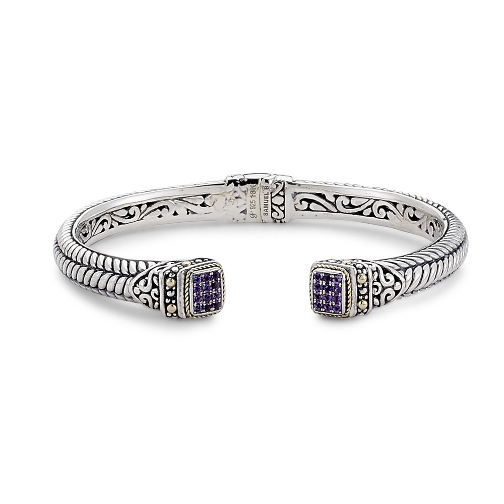 Sterling Silver and 18K Woven Design Pave Amethyst Hinged Bangle