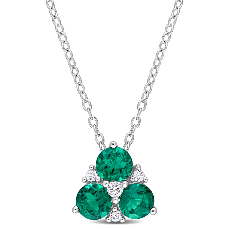 Make every occasion special with this gorgeous Created Emerald and Created White Sapphire Three-Stone Pendant with Chain. Crafted in lustrous sterling silver, this opulent pendant with chain features three round-cut prong-set created emerald (4.5x4.5mm)gemstones studded with four round-cut, prong-set created white sapphire (2x2mm)(1.5x1.5mm) gemstones in a floral design. Enhanced with a polished finish, this exquisite pendant is suspended on an 18-inch round cable chain secured with a spring-ring clasp. Deck your neck with this quintessential style for a flattering look.