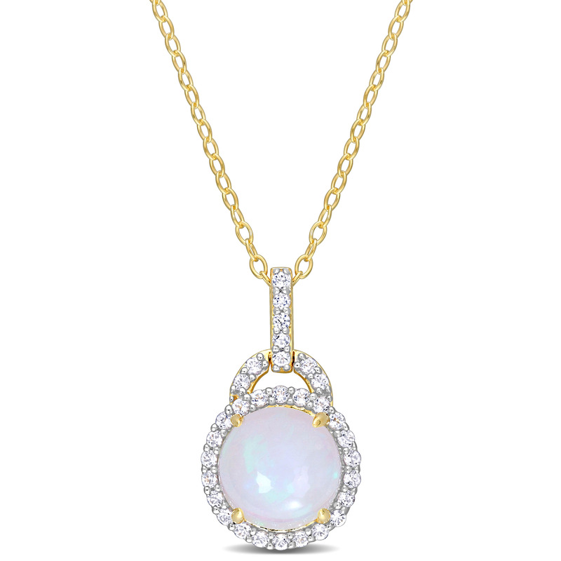 Accessorize flawlessly with this elegant Ethiopian Blue Opal and White Topaz Halo Pendant. Crafted in lustrous yellow plated sterling silver, this stunning pendant features a round-cut, prong-set Ethiopian blue opal gemstone (9x9mm) at the center, beautifully encased by 31 created white topaz (1.3x1.3mm) gemstones in a halo design. Polished brilliantly, the splendid pendant is suspended on an 18-inch long round cable chain and secured with a spring-ring clasp. Coordinate with a matching ring for a seamless appearance.