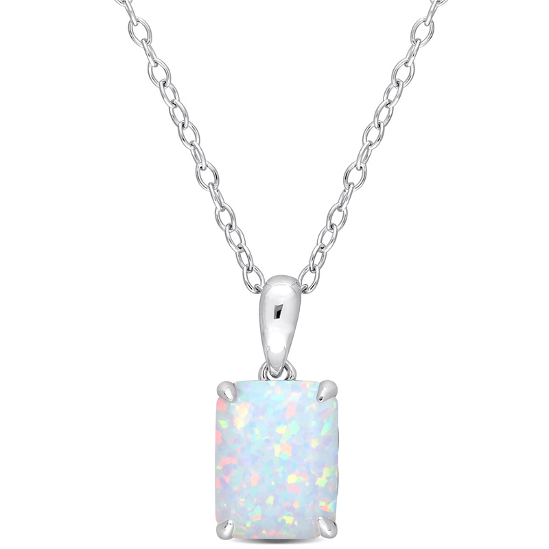 If you are looking for a versatile accessory that suits every outfit, then this Created Opal Solitaire Pendant with Chain is for you. Crafted in luminous sterling silver, this elegant pendant features an emerald-cut, 4 prong-set created opal gemstone (9x7mm) with heart design details on the sides. Polished to a brilliant shine, this splendid pendant is suspended on an 18-inch round cable chain secured with a spring ring clasp. A perfect piece to shower yourself with some love.