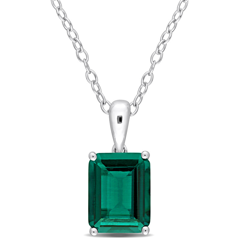 Celebrate her victory by gifting this stylish Created Emerald Solitaire Pendant with Chain. Crafted in sparkling sterling silver, this appealing pendant features an emerald-cut, 4 prong-set created emerald gemstone (9x7mm) with heart design details on the sides. Polished to a brilliant shine, this trendy pendant is suspended on an 18-inch round cable chain secured with a spring ring clasp. An accessory that will always remind her of you.