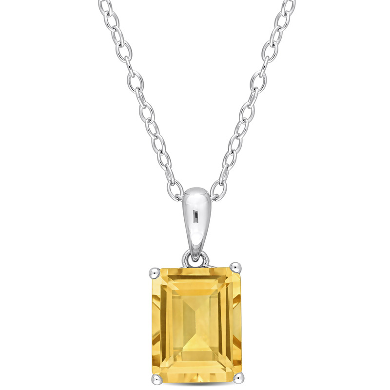 Let your style do the talking with this glamorous Citrine Solitaire Pendant with Chain. Crafted in sparkling sterling silver, this charming pendant features an emerald-cut, 4 prong-set citrine gemstone (9x7mm) with heart design details on the sides. Polished to a brilliant shine, this exquisite pendant is suspended on an 18-inch round cable chain secured with a spring ring clasp. An evergreen addition to your collection.
