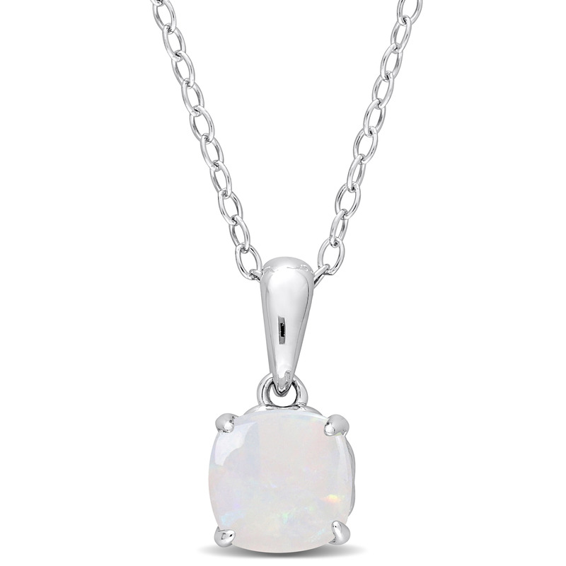 Make the courtship special with this priceless Opal Solitaire Pendant with Chain. Crafted in luminous sterling silver, this classy pendant features a princess-cut, 4 prong-set opal gemstone (6x6mm) with heart design details on the sides. Polished to a brilliant shine, this elegant pendant is suspended on an 18-inch round cable chain secured with a spring ring clasp. A flawless accessory that will ignite the spark in your relationship.
