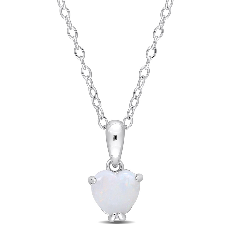Jazz up your outfit with this Opal Solitaire Pendant with Chain. Crafted in intricate sterling silver, it features a heart-cut, 3 prong-set opal gemstone (6x6mm) studded in a classic heart detail basket setting. Enhanced with a high polish finish, this beautiful pendant is suspended on an 18-inch round cable chain and secures with a spring ring clasp. This pendant with chain is perfect for layering.