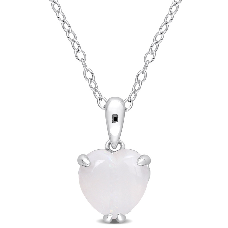 That very special someone deserves this glamorous Opal Solitaire Pendant with Chain. Crafted in glittering sterling silver, it features a heart-cut, 3 prong-set opal gemstone (8x8mm) embellished in a heart detail basket setting. Polished to a brilliant shine, this pendant is suspended on an 18-inch round cable chain and secures with a spring ring clasp. Choose this solitaire pendant to add a touch of elegance to your style.