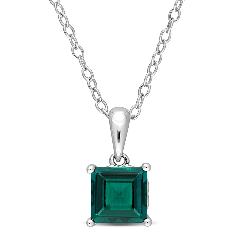 Stand out at the wedding party with this captivating Created Emerald Solitaire Pendant with Chain. Crafted in sparkling sterling silver, this charming pendant features a princess-cut, 4 prong-set created emerald gemstone (6x6mm) with heart design details on the sides. Polished to a brilliant shine, this exquisite pendant is suspended on an 18-inch round cable chain secured with a spring ring clasp. A stylish accessory that you will proudly flaunt.