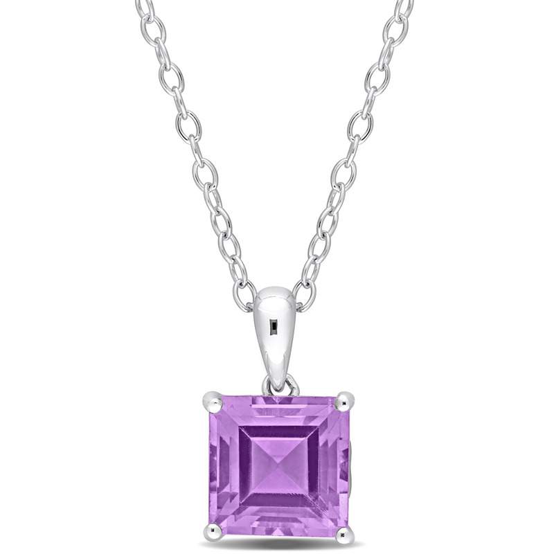 Get a splendid look with this classy Amethyst Solitaire Pendant with Chain. Crafted in lustrous sterling silver, this splendid pendant features a princess-cut, 4 prong-set amethyst gemstone (8x8mm) with heart design details on the sides. Polished to a brilliant shine, this ravishing pendant is suspended on an 18-inch round cable chain secured with a spring ring clasp. A perfect accessory for every kind of ensemble.