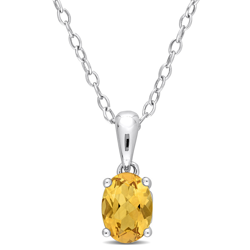 Glam up your outfit with this charming Citrine Solitaire Pendant with Chain. Crafted in sparkling sterling silver, this radiant pendant features an oval-cut, 4 prong-set citrine gemstone (7x5mm) with heart design details on the sides. Polished to a brilliant shine, this exquisite pendant is suspended on an 18-inch round cable chain secured with a spring ring clasp. A must have for a trendy look.