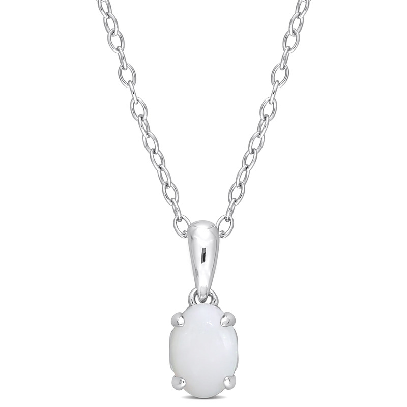 Get a mesmerizing evening look with this splendid Opal Solitaire Pendant with Chain. Crafted in luminous sterling silver, this exquisite pendant features an oval-cut, 4 prong-set opal gemstone (7x5mm) with heart design details on the sides. Polished to a brilliant shine, this elegant pendant is suspended on an 18-inch round cable chain secured with a spring ring clasp. A timeless addition that will always keep you in style.