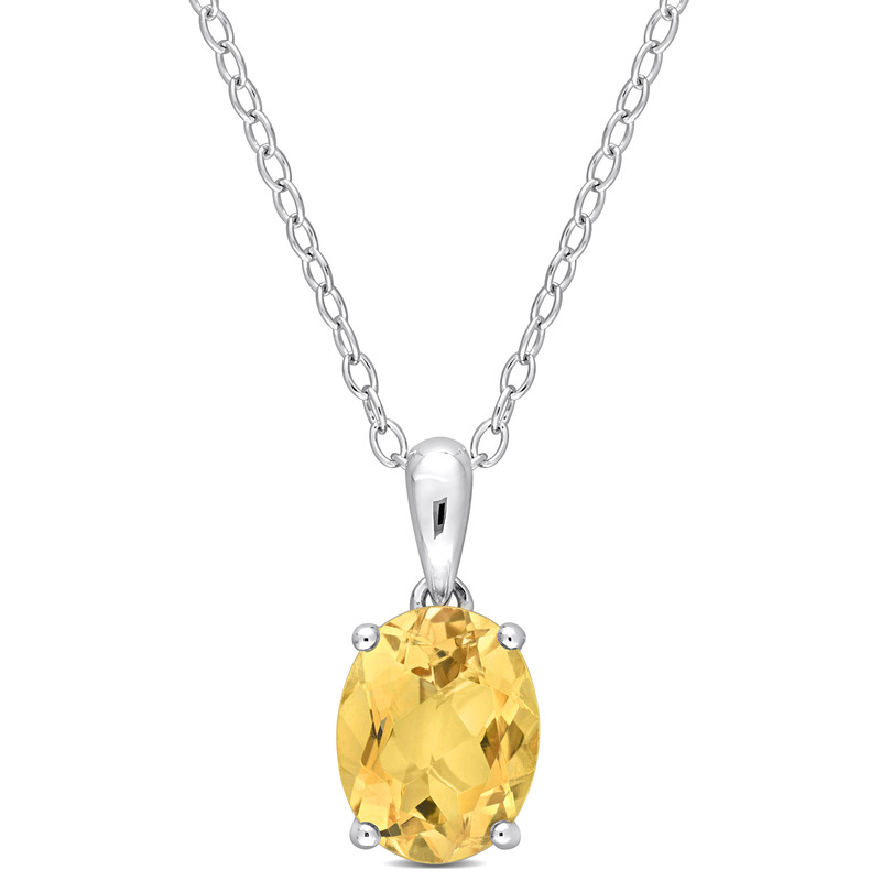 Be the noise in the crowd with this eye-catching Citrine Solitaire Pendant with Chain. Crafted in sparkling sterling silver, this charming pendant features an oval-cut, 4 prong-set citrine gemstone (9x7mm) with heart design details on the sides. Polished to a brilliant shine, this splendid pendant is suspended on an 18-inch round cable chain secured with a spring ring clasp. A perfect party accessory.