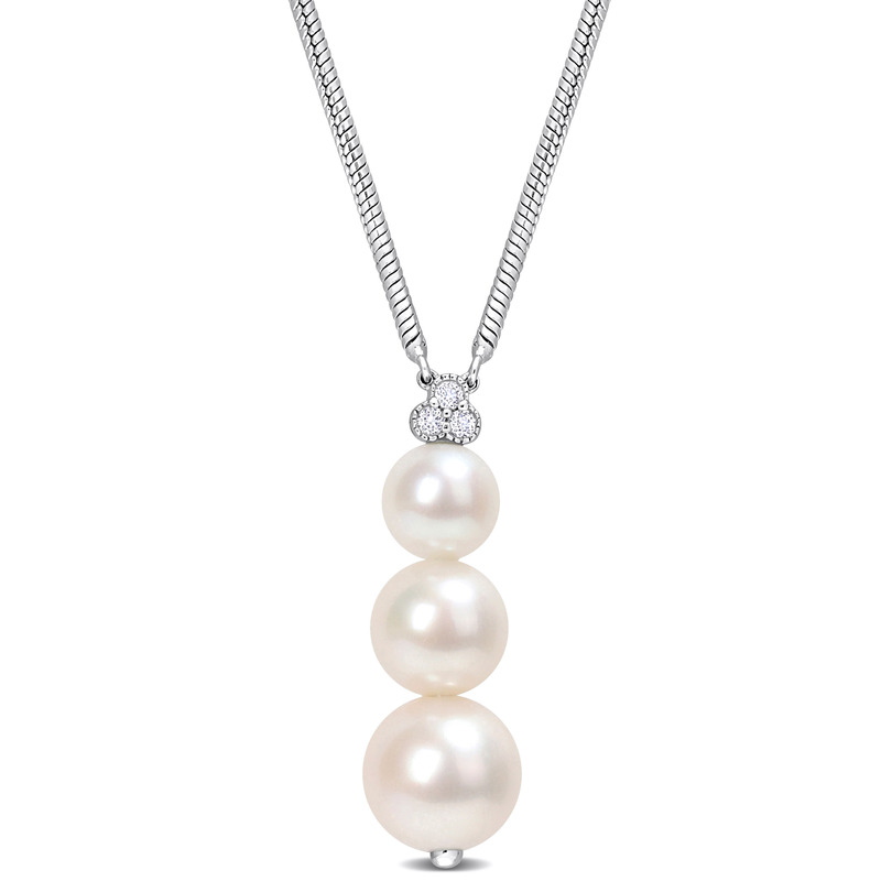 This eye-catching Freshwater Cultured Pearl and White Topaz Linear Necklace is crafted in lustrous sterling silver and features three round-shape freshwater cultured pearls (7-7.5mm) studded in a graduated style with three round-cut, bezel-set white topaz gemstones (1.5 x 1.5mm). Enhanced with a milgrain shine, this necklace is suspended on 18-inch snake chain and secures with a lobster clasp. Pair this necklace with any ensemble for a elegant look.