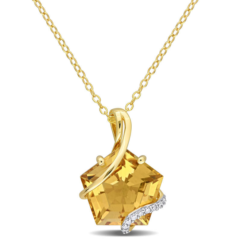 Accentuate your beauty with this charming Wrapped Stone Pendant with Chain. Crafted in sparkling yellow plated sterling silver, this glistening pendant features a fancy-shaped, prong and channel-set citrine gemstone (12x12mm) wrapped in 11 round-cut, prong-set diamonds (H-I, I3). Polished to brilliance, this eye-catching pendant is suspended on an 18-inch round cable chain and secured with spring ring clasp. Be the center of attention at the next social event with this ravishing pendant.