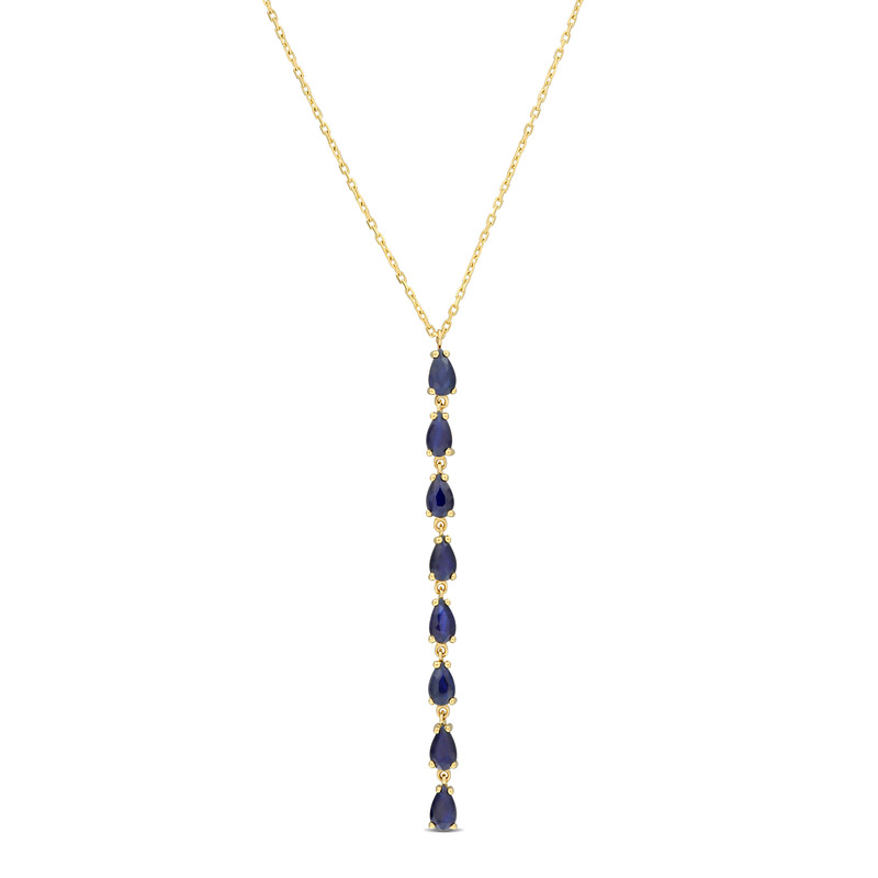 Elevate your style with our 2ct TGW Pear Shape Blue Sapphire Linear Necklace in 10k Yellow Gold. This exquisite piece features a linear design with pear-shaped blue sapphires, totaling 2 carats, set in lustrous 10k yellow gold. With a 16.5-inch length, it gracefully drapes along your neckline, making it a captivating addition to any outfit.