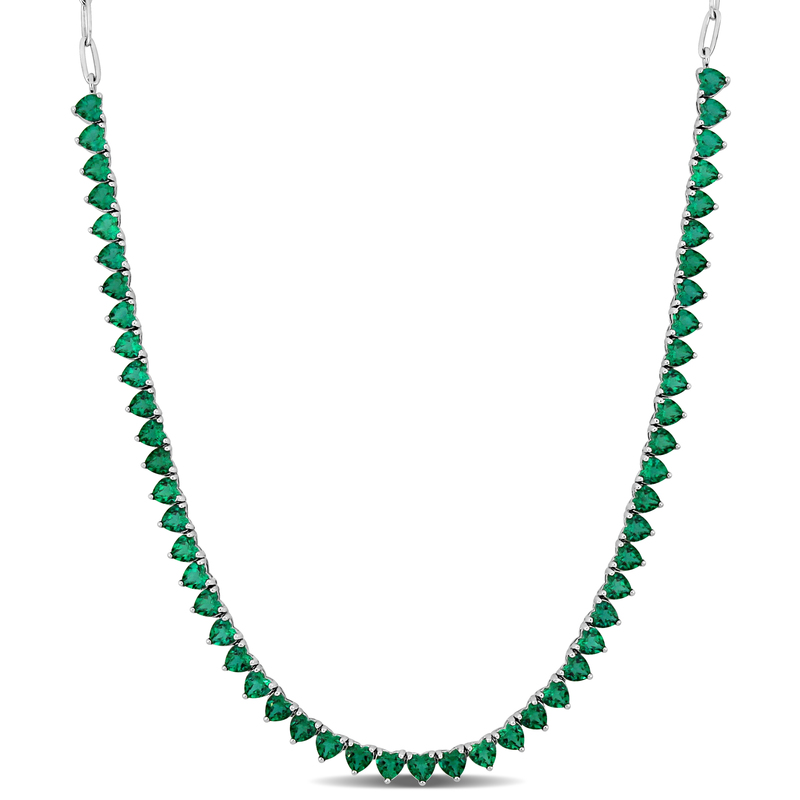 Indulge in the captivating beauty of this exquisite tennis necklace featuring 13 1/3 carats total weight of emerald gemstones crafted in shimmering sterling silver. The alluring green hue of the created emeralds in classic round cut is sure to make a statement and add a touch of sophistication to any outfit. With an adjustable length of 18 inches plus an additional 2 inches, you can customize the fit to your liking. Perfect for formal occasions or to elevate your everyday look, this tennis necklace is a must-have in any jewelry collection.