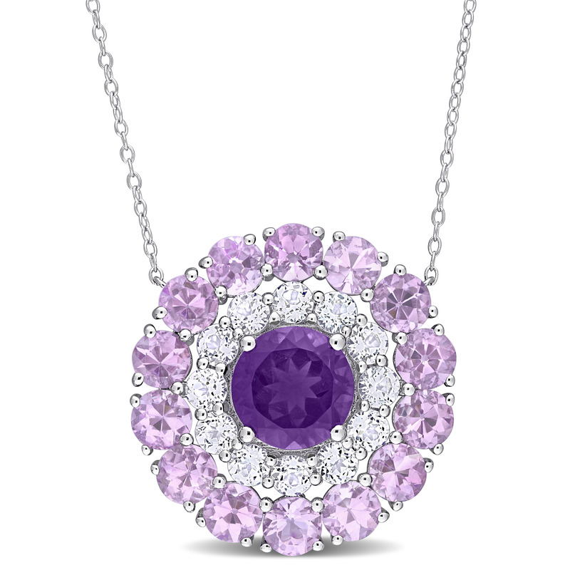 Break the stereotypes and express your love for her with this glamorous Double Halo Necklace. Crafted in sparkling sterling silver, this charming necklace with tonal gems showcases a round-cut, prong-set African amethyst gemstone (10x10mm) at the center surrounded by 14 round-cut, prong-set amethyst gemstones (5x5mm) and 12 round-cut, prong-set white topaz gemstones (3.5x3.5mm). Polished to brilliance, this exquisite necklace is suspended on an 18-inch round cable chain and secured with a spring ring clasp. An accessory that is sure to melt her heart.