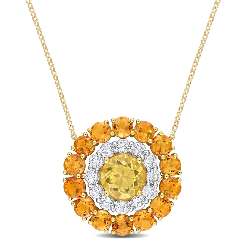Be a trendsetter and get featured on fashion blogs with this captivating Double Halo Necklace. Mounted in glistening yellow gold plated sterling silver, this charming necklace features a round-cut, prong-set citrine gemstone (10x10mm) at the center surrounded by 14 round-cut, prong-set Madeira citrine gemstones (5x5mm) and 12 round-cut, prong-set white topaz gemstones (3.5x3.5mm). Enhanced with a high polished finish, this dainty necklace is suspended on an 18-inch round cable chain and secured with a spring ring clasp. An accessory that will always keep you in the limelight.