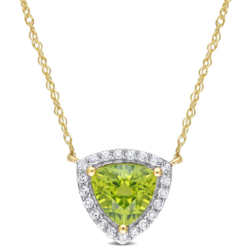 Offer a perfect gift of love with this Peridot and White Topaz Halo Necklace with Chain. Mounted in lustrous yellow gold, it features a trilliant-cut, prong-set peridot gemstones (7 x 7mm) with a halo of 21 round-cut, prong-set white topaz gemstones. Polished to a brilliant shine, this gorgeous pendant is suspended on 17-inch rope chain and secures with a spring ring clasp. This unique cut halo pendant is an ideal choice for your beloved that she can wear with both casual and evening attire. Perfect for layering with other necklaces.
