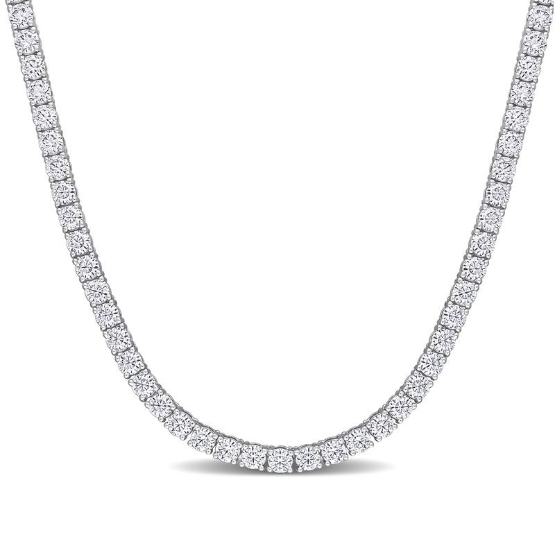 Demonstrate your affection with this warm hued Created Moissanite Tennis Necklace. Mounted in lustrous white gold and features 113 round-cut, prong-set created moissanite gemstones (3.5 x 3.5mm) studded in tennis style. Polished to a brilliant shine, this necklace measures 17-inch in length and secures with a lobster clasp. This charming and timeless necklace is the perfect addition to any jewelry collection.