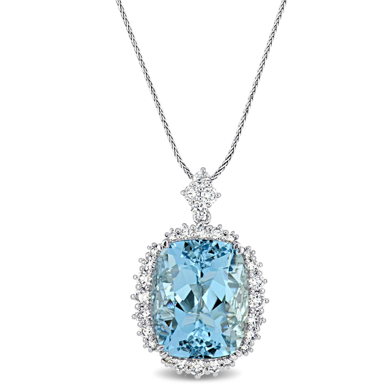 Brighten your look with this enchanting one-of-a-kind aquamarine and diamond piece. Crafted in 14-karat white gold, this pendant features a cushion-cut, prong-set aquamarine gemstone at its center in a unique halo of 20 round-cut, micro-set shimmering diamonds. This bold and trendsetting piece is sure to make a standout addition to any jewelry collection. Choose this piece either for yourself or someone you love. An outstanding choice for that special March birthday in your life. Truly a one-of-a-kind piece.