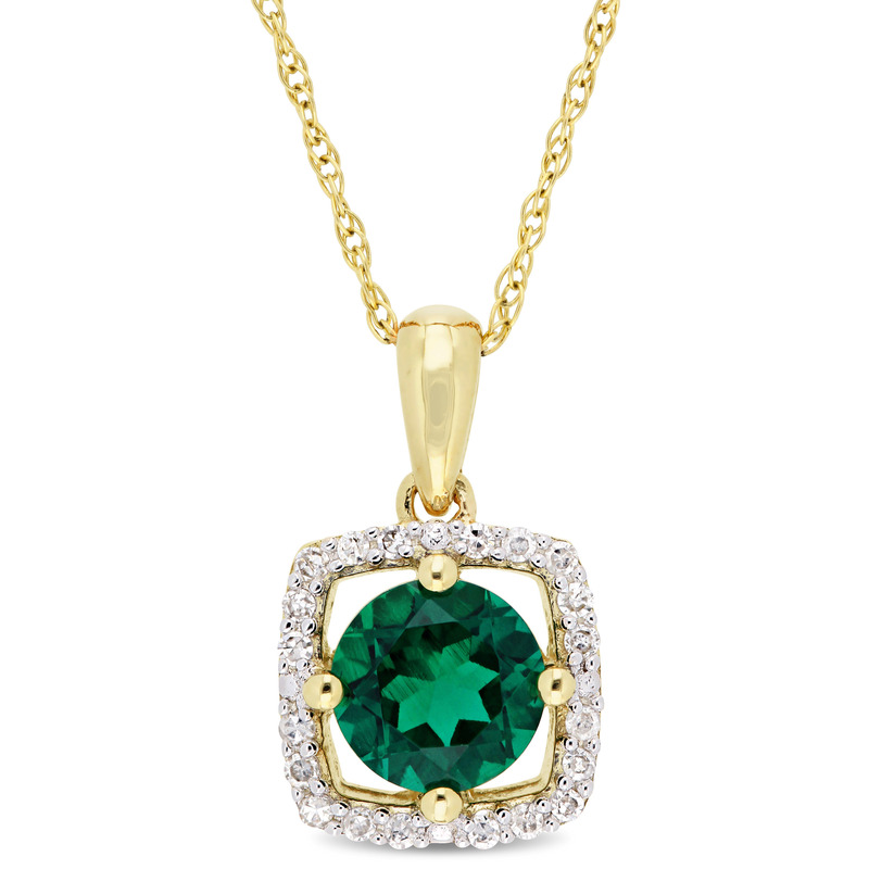 Get your hands on this bejeweled Created Emerald Diamond Floating Square Halo Pendant Necklace and look your absolute best. Crafted in lustrous yellow gold, this stunning pendant with a chain showcases one prong-set, round-cut created emerald (6 x 6mm) gemstone decorated in a floating halo design created by 20 prong-set round-cut diamonds (G-H-I, I2-I3). Enhanced with a polished finish, this exquisite pendant is suspended on a 17-inch rope chain secured with a spring-ring clasp. Coordinate this exceptional necklace with your favorite cocktail ensemble.