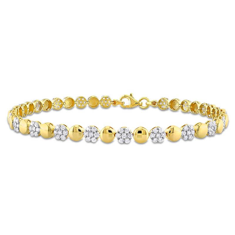 Adorn your wrist with the exquisite beauty of our 1 3/4ct TDW Diamond Circle and Flower Design Tennis Bracelet in 10k Yellow Gold. Measuring 7.5 inches, this bracelet artfully combines the brilliance of diamonds with a delicate circle and flower motif. Crafted in radiant yellow gold, it's a testament to both luxury and intricate design, perfect for adding a touch of elegance to any occasion. Elevate your style with this captivating piece that captures the essence of timeless sophistication.