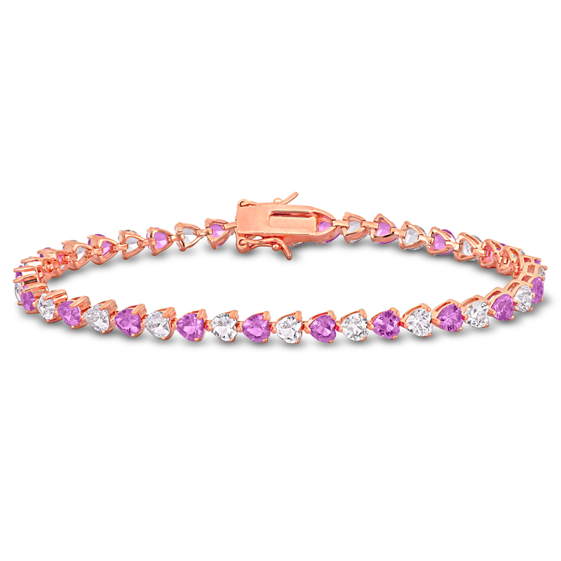 This stunning bracelet features 12 carats total gem weight of created pink and white heart-cut sapphires set in rose sterling silver. The bracelet is 7.5 inches in length and secures with a sturdy clasp. The alternating pink and white sapphires create a beautiful and eye-catching pattern that is sure to draw attention. The rose sterling silver setting adds a touch of elegance to this already stunning piece of jewelry. This bracelet would make a perfect gift for someone special or a lovely addition to your own jewelry collection.