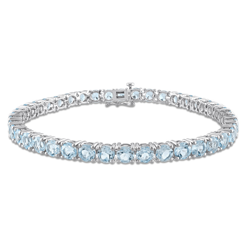 Get the perfect wedding accessory with this classy Tennis Bracelet. Crafted in sparkling sterling silver, this stunning bracelet showcases 35 round-cut, prong-set sky blue topaz gemstones (5x5mm). Enhanced with a high polished finish, this glamorous 7.25-inches bracelet is comfortably secured with a box clasp. Look classy and sophisticated at the upcoming high profile event with this premium jewelry.