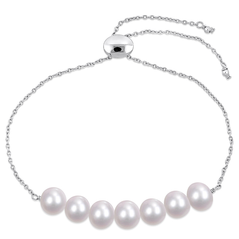 This pearl bar station bracelet is crafted in sterling silver and features seven round cultured freshwater pearls at the center in a bar station design. Enhanced with a high polish finish, this stunning adjustable bolo bracelet is the perfect addition to any jewelry collection.