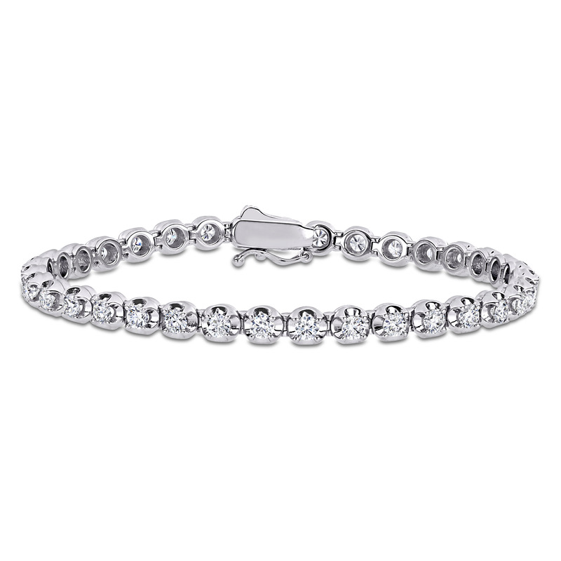 This shimmering created white moissanite tennis bracelet is crafted in lustrous 14-karat white gold and features a total of 35 round-cut, prong-set created white moissanites in a unique beaded tennis bracelet design. A sumptuous piece for all occasions, this gemstone bracelet is sure to make a standout addition to any jewelry collection. Choose this glistening created moissanite bracelet either for yourself or as a special gift for someone you love.