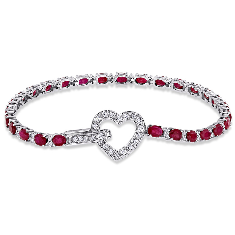 This breathtaking heart enhancer tennis bracelet is crafted in 18-karat white gold and features 28 oval-cut, prong-set ruby gemstones with 23 round-cut, pave-set and 54 round-cut, prong-set diamonds augmented on an open heart and also studded on the enhancer. Give yourself a glamorous look with this trendsetting heart charm station tennis bracelet.
