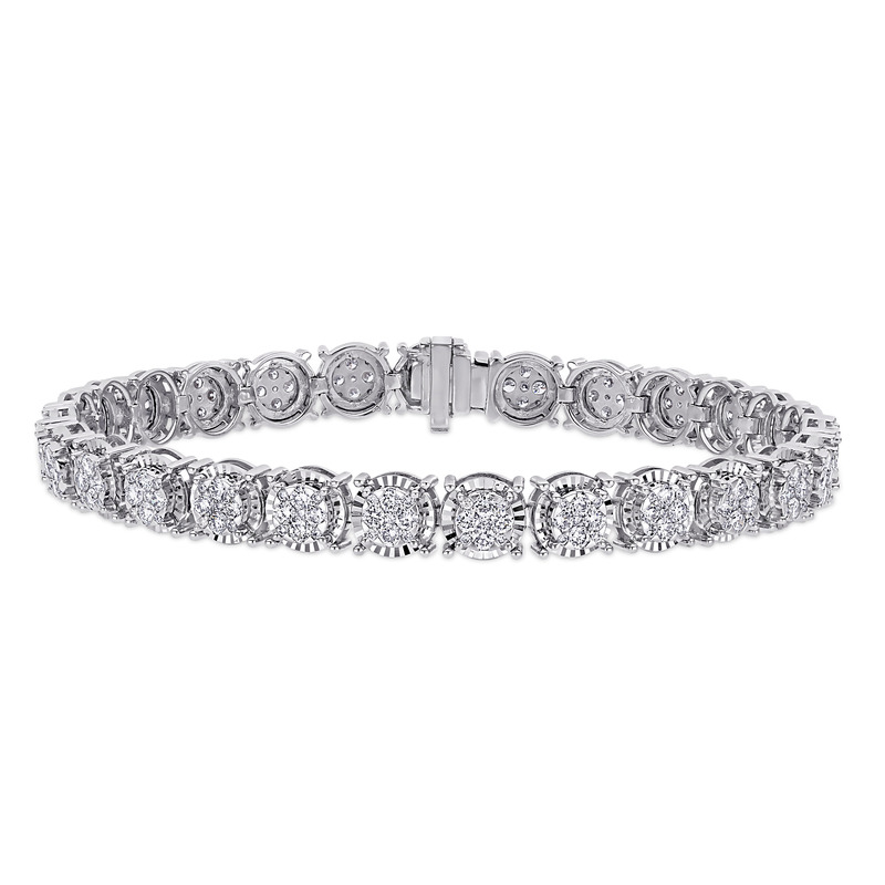 This splendid tennis bracelet is crafted in 14-karat white gold and features 135 round-cut, tension-set and 108 round-cut, prong-set diamonds studded in a tennis style. Enhanced with a high polish finish, this marvelous bracelet is a valuable addition to any jewelry collection. Create an elegant and sophisticated look when you add this diamond tennis bracelet to your outfit.