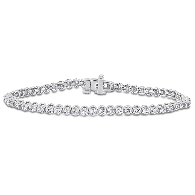 This luxurious diamond tennis bracelet is crafted in 14-karat white gold and features 56 round-cut, prong-set shimmering diamonds. Enhanced with a high polish finish, this diamond bracelet will make a standout addition to any jewelry collection. Elegant and refined, this exquisite bracelet will add a touch of dazzling charm to your look.