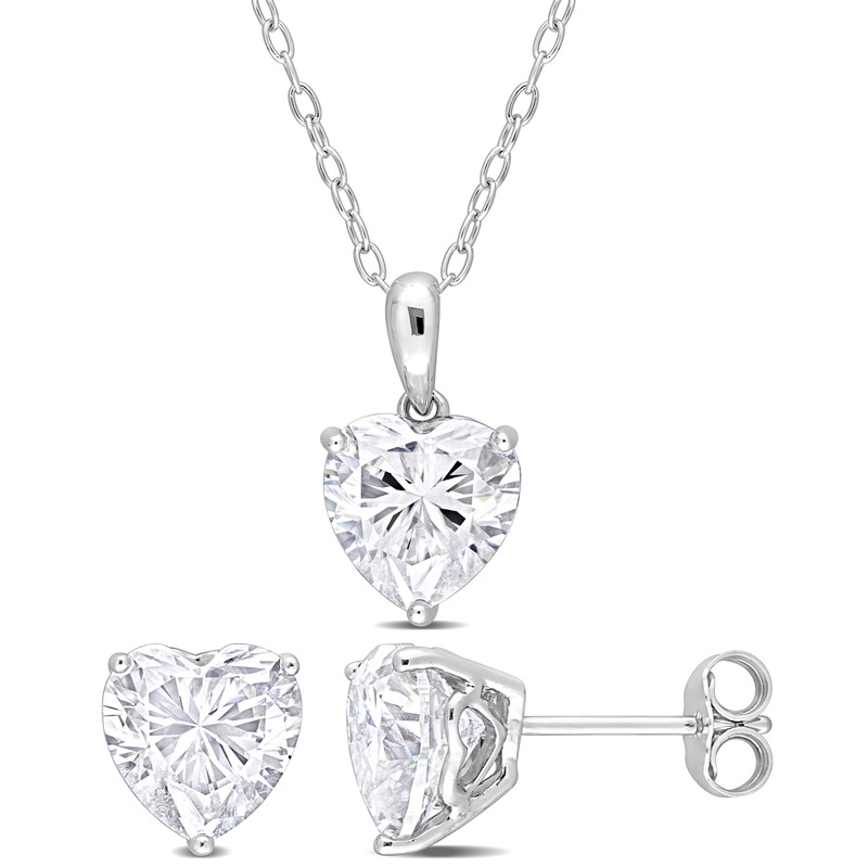 Gift your loved one this enchanting Created White Moissanite Heart 2-Piece Solitaire Pendant and Stud Earrings Set. Crafted in lustrous sterling silver, this gorgeous jewelry set features three heart-cut 4 prong-set, created white moissanite (8x8mm) gemstones in a classic heart design detail on the earrings and pendant setting. Enhanced with a polished finish, the exquisite pendant is suspended on an 18-inch round cable chain secured with a spring-ring clasp, and the matching basic solitaire earrings are secured with butterfly closures. A lovely set that is worth treasuring.