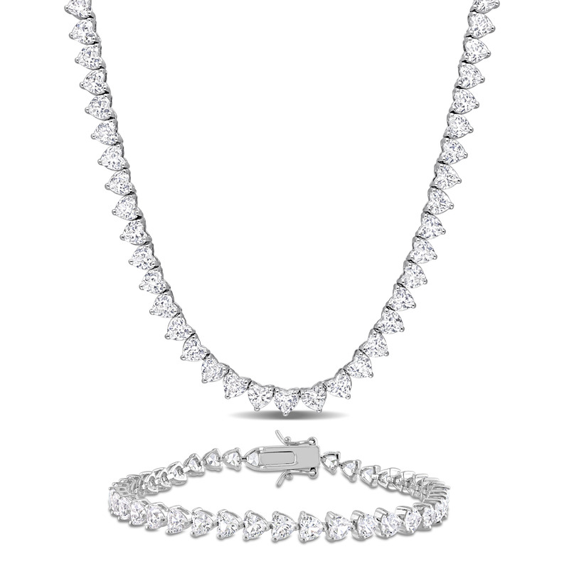 This 41 1/5 CT TGW Created White Sapphire Tennis Necklace and Bracelet Set in Sterling Silver is the epitome of luxury and sophistication. The set features a stunning necklace measuring 18.5 inches and a matching bracelet at 7.5 inches, each adorned with a continuous line of brilliant created white sapphires. Crafted in polished sterling silver, both pieces provide a sleek and timeless backdrop that enhances the sapphires' radiant sparkle. Perfect for adding a touch of elegance to any outfit, this set is ideal for special occasions or elevating everyday wear with a glamorous touch.