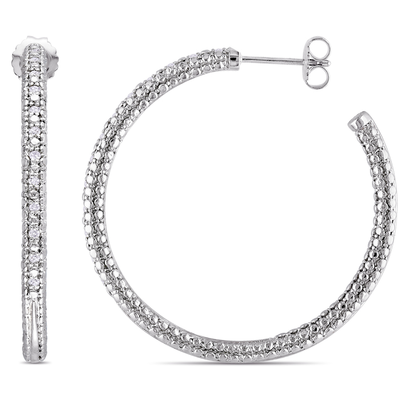 These 1/4 CT TW diamond hoop earrings feature shimmering diamonds set in sleek sterling silver. Their timeless hoop design offers a perfect blend of elegance and versatility, making them ideal for both casual and formal occasions. Crafted for comfort and durability, these earrings add a touch of sparkle to any outfit. A stunning addition to any jewelry collection.