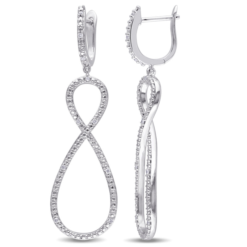 These 1/10 CT TW diamond infinity drop earrings showcase a sleek infinity design adorned with sparkling diamonds, set in sterling silver. The elegant drop style adds movement and grace, perfect for adding a touch of sophistication to any outfit. Ideal for both casual and formal occasions, these earrings symbolize everlasting love and beauty. Crafted for lasting shine, they make a timeless addition to any jewelry collection.