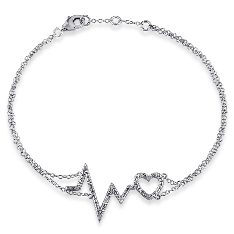 This diamond accent heartbeat bracelet features a sleek heartbeat design paired with a delicate heart, set in polished sterling silver. Measuring 7.25 inches, the bracelet is adorned with sparkling diamond accents, adding a touch of brilliance to its unique and meaningful design. Symbolizing life and love, this bracelet makes a perfect gift or an everyday accessory. Crafted for both style and durability, it offers a modern and elegant addition to any jewelry collection.