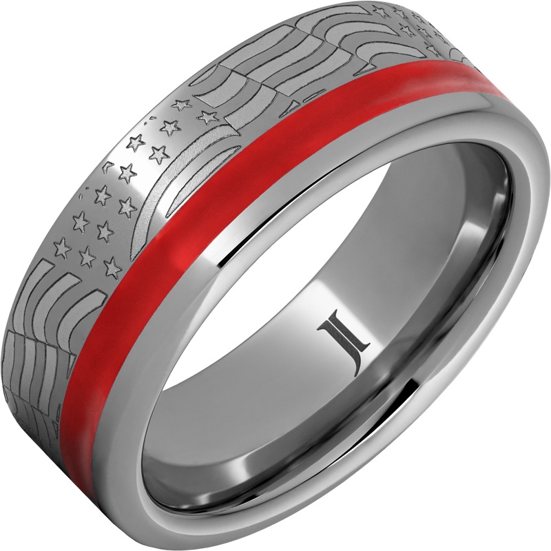 Released this year to commemorate the 250th anniversary of the signing of the Declaration of Independence, this Rugged Tungsten™ ring features a stylized engraving of the American Flag waving in the wind, flanked by a red enamel inlay. The ring is also made in Serinium® (RMSA007908) and Black Diamond Ceramic™ (RMCA007908), and is available with Bourbon Barrel wood inlay (the Whiskey Rebellion ring), blue enamel inlay, and crushed coral or lapis inlay.