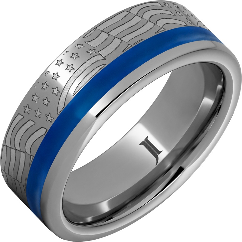 Released this year to commemorate the 250th anniversary of the signing of the Declaration of Independence, this Rugged Tungsten™ ring features a stylized engraving of the American Flag waving in the wind, flanked by a blue enamel inlay. The ring is also made in Serinium® (RMSA007908) and Black Diamond Ceramic™ (RMCA007908), and is available with Bourbon Barrel wood inlay (the Whiskey Rebellion ring), blue enamel inlay, and crushed coral or lapis inlay.