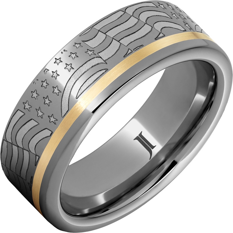 Proudly wear Old Glory on your finger! This Rugged Tungsten™ ring is laser engraved with the stars and stripes of the American flag, bordered by a solid 14k yellow gold inlay. Also available with rose gold inlay (RMWA007937), in Black Diamond Ceramic™ (RMCA007936) and Serinium® (RMSA007936). Inside rounded Comfort Fit for wearability.