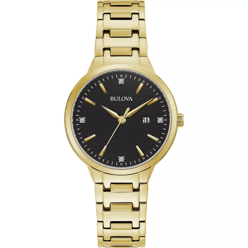 Ladies Yellow Round Black Dial 4 Round Dial With 4 Round Diamonds & Date 30M Water Resistance Yellow Bracelet 32mm Case Bulova Watch