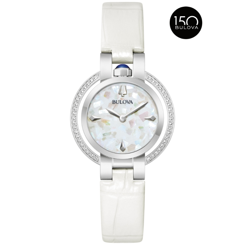 Rubaiyat is a name of poetic significance and timeless elegance. Introduced in 1917, the Rubaiyat collection marked Bulova's debut series of timepieces designed specifically for women. Now, over a century later, and in celebration of Bulova's 150th anniversary, the new Rubaiyat "Four Seasons" luxury collection captures the elegance of the Rubaiyat line and the true beauty of nature. The Rubaiyat "Winter" shines with 42 white sapphires, totaling .25 ctw, evoking an icy winter landscape encircling its silver-tone stainless steel petite 30mm halo case and synthetic spinel cabochon crown. The mosaic dial, crafted from lustrous white mother-of-pearl, shimmers like freshly fallen snow, with an iridescent quality that makes each dial unique, accented by icicle-shaped faceted markers and finished with a double curved sapphire crystal. Paired with a glossy white alligator grain strap with a custom fold over strap with two pushers, this luxurious women's timepiece adds elegance to any occasion and comes in special Rubaiyat packaging, complete with a storybook.