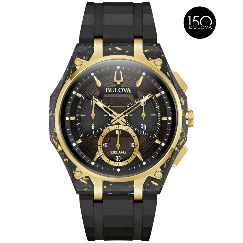 Discover new horizons with the boldest Bulova CURV yet, made in celebration of Bulova's historic 150th Anniversary. Daringly innovative, this new CURV features a case made from forged carbon infused with 97.97% pure? gold flake for a unique luster, appointed with a novel gold-tone stainless steel bezel attached with visible screws and creating striking contrast and eliciting the richness of the gold flake in the case. The process of creating the specialized forged carbon ensures that each case is unique in its patterning. A? dramatically curved sapphire crystal reveals a multilayered black dial with gold-tone accents, offering a glimpse at the revolutionary curved NR20 CURV high-precision quartz chronograph movement,? which is further revealed through the exhibition window in the gold-tone stainless steel case back. Completing the contemporary look, the watch is equipped with an HNBR premium rubber strap?, with stylized comfort and a foldover buckle. Capturing modern style and cutting-edge technology, this new Bulova CURV brings an undeniable edge to any ensemble and reaffirms Bulova's place at the frontier of watchmaking.