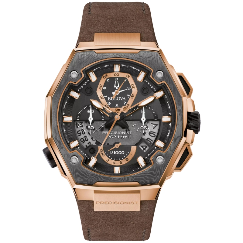 Marking the 10th anniversary of the Precisionist movement, the Series X Special Edition is a celebration of unparalleled accuracy. The special edition timepiece features a distinctive rose gold-tone stainless steel case with a gray Damascus steel top ring insert. The black dial features a calendar window and a view into the proprietary Precisionist eight-hand chronograph high-precision quartz movement. The fine brown leather strap is complete with a deployant buckle. The case features a curved sapphire crystal with AR coating, screw down case back, and water resistance to 50 meters.