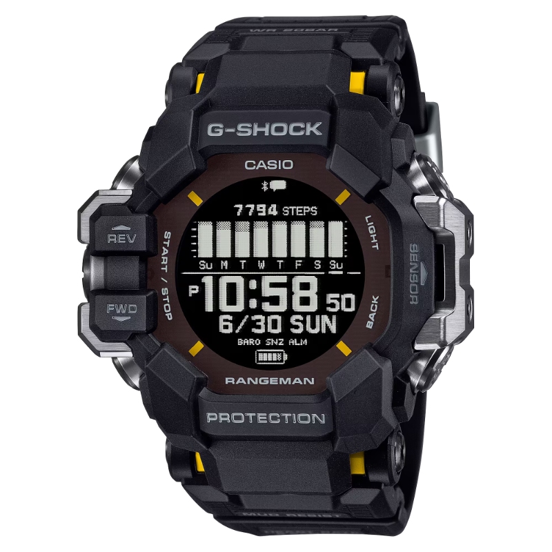 GENTS ALL BLK 'RANGEMAN' SOLAR SMART WATCH W/CHARGE CABLE DIGITAL MOBILE LINK BLUE TOOTH 6 SENSORS+GPS FUNCTION TO TRACK REAL TIME WORK OUTS, RUN,SWIM, BIKE HEART ANALYSIS FUNCTION WORLD TIME 4 ALARMS STOPWATCH 200M WR BLACK W/ YELLOW BAND G SHOCK CASIO