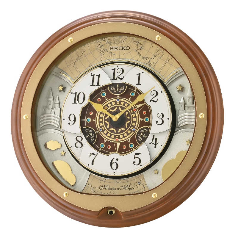 Melodies In Motion Brown W/ Gold Tone Round World Map Whimsical Castle & Clouds Motif On The Hour Dial Opens & Turns Playing 18 Melodies Classic + Christmas On/Off Switch Seiko Clock 16.53 X 16.53 X 4.33